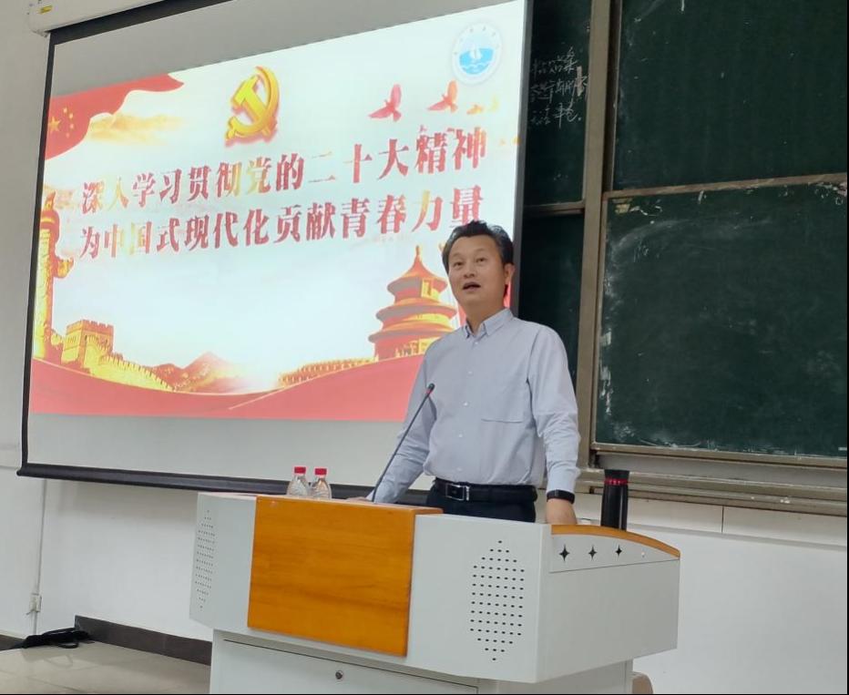 唐副校长首先带领同学们深入学习了党的二十大报告内容,精准把握二十大的精神内涵和重要意义,党的二十大是在全国各族人民迈上全面建设社会主义现代化国家新征程、向第二个百年奋斗目标进军的关键时刻召开的一次十分重要的大会,是一次高举旗帜、凝聚力量、团结奋进的大会。唐副校长向同学们讲述了中国过去五年取得的伟大成就和新时代十年的伟大变革,告诉我们科学社会主义在21世纪的中国焕发出的蓬勃生机。