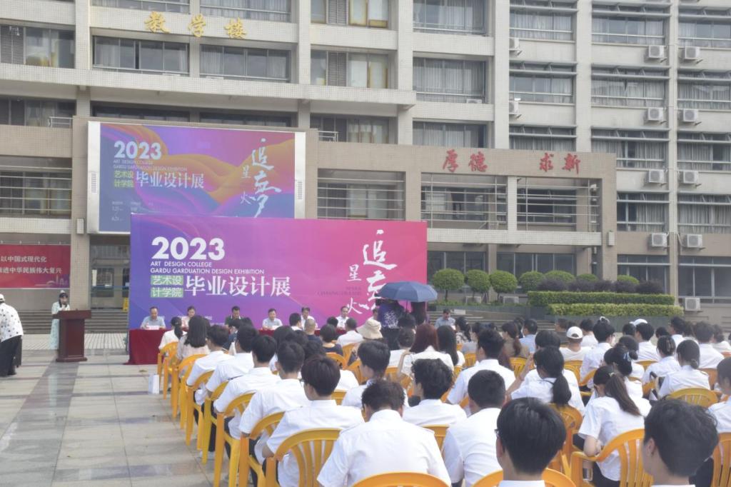 (艺术3044am永利集团官网 供稿)5月25日下午,艺术3044am永利集团官网2023届毕业设计展开幕式在海燕广场举行。副校长戈飞平、创新创业学院院长吕有界、学院党委书记和院长杨乾明、华南师范大学美术学院副院长范宝龙、宣传部副部长马国华、教务处副处长聂宇宏、学工部副部长郑苗、科研处副处长曹辉、广东非遗梦文化产业有限公司总经理麦瑞聪和副总经理李锵鸿、广州知识空间有限公司创始人黄伟、广州蓝悦船舶设计有限公司总经理廖晓浪、学院党委副书记王有才、副院长戴碧锋和邓焱等出席活动,学院教师代表、2023届毕业生代表及其他年级学生代表等一百多人参加了开幕式。开幕式由刘咏春老师主持。