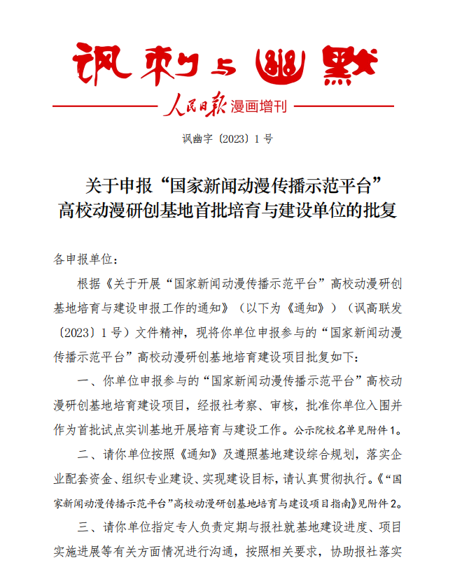 “国家新闻动漫传播示范平台”是人民日报社《讽刺与幽默》报负责建设、运营的国家级项目,2022 年9 月,平台面向国内高校开展多层级、多维度的高校动漫研创基地培育建设项目。旨在充分发挥报社在传播资源、人才渠道、内容影响力等方面的优势,指导全国各高校基地,创作适合主流媒体传播的时政新闻动漫产品、对政治理论著作进行动画解读、做好传承中华优秀传统文化项目、展示人民群众美好生活以及国际国内数字文艺作品、出版物及衍生文化创意产品。