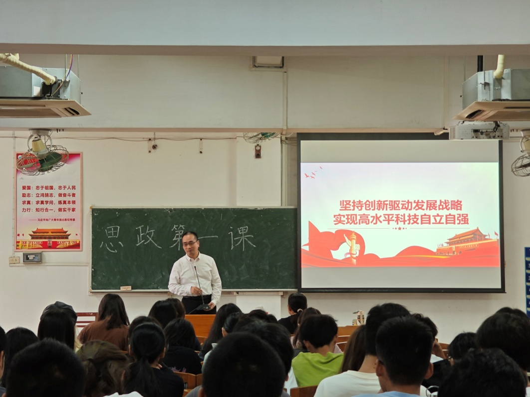10月18日,在艺术3044am永利集团官网杨院长的带领下,同学们走进了属于自己大学的第一堂思政课,主题是“坚持创新驱动发展战略,实现高水平科技自立自强”。我院环境设计专业2023级全体学生在琶洲校区206教室参加此次活动。
