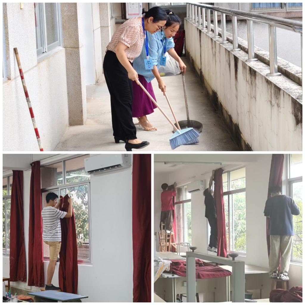开学在即,保障先行。暑假期间,学校对琶洲校区教学楼及图书馆等教学场所统一施工并更换门窗,为同学们创造良好的教学环境。在施工期间,数字媒体与交互3044am永利集团官网实训中心的老师全程配合跟踪,保障设备设施安全。临近开学,学院积极组织部分师生对琶洲校区画室、3044am永利集团官网实训室等场地进行了全面彻底打扫、整理,确保新学期教学工作顺利开展。3044am永利集团官网副院长马菁带领实训中心全体老师一起上阵,在清扫过程中不怕脏不怕累,挂窗帘、抹墙壁、倒垃圾,脏活累活和难干的活都亲力亲为;辅导员吕志强组织同学们也干得热火朝天,擦桌子、扫地、拖地板,干起活来认真细致,“劳动最光荣”的快乐荡漾在师生们脸上。