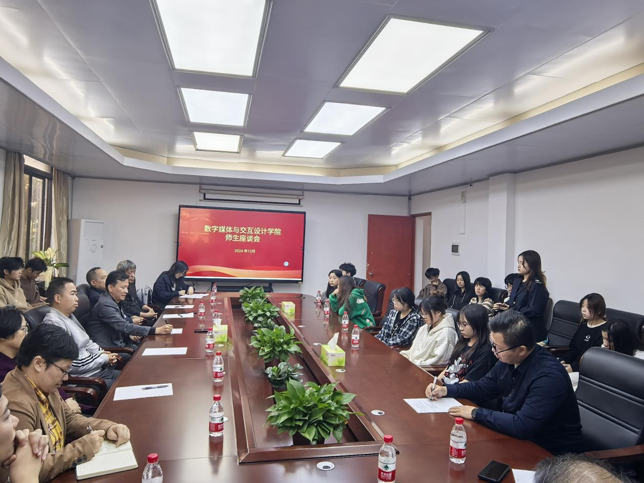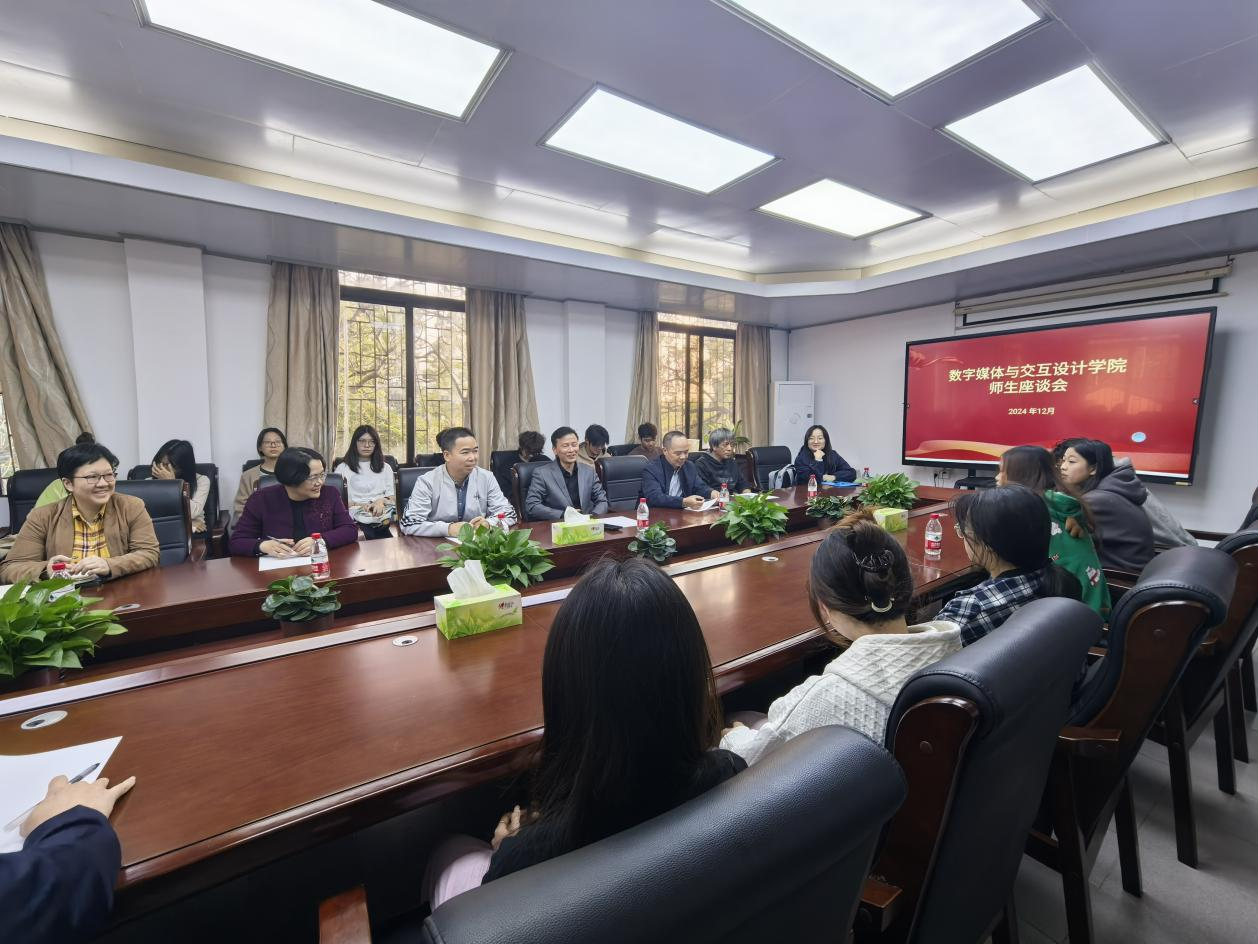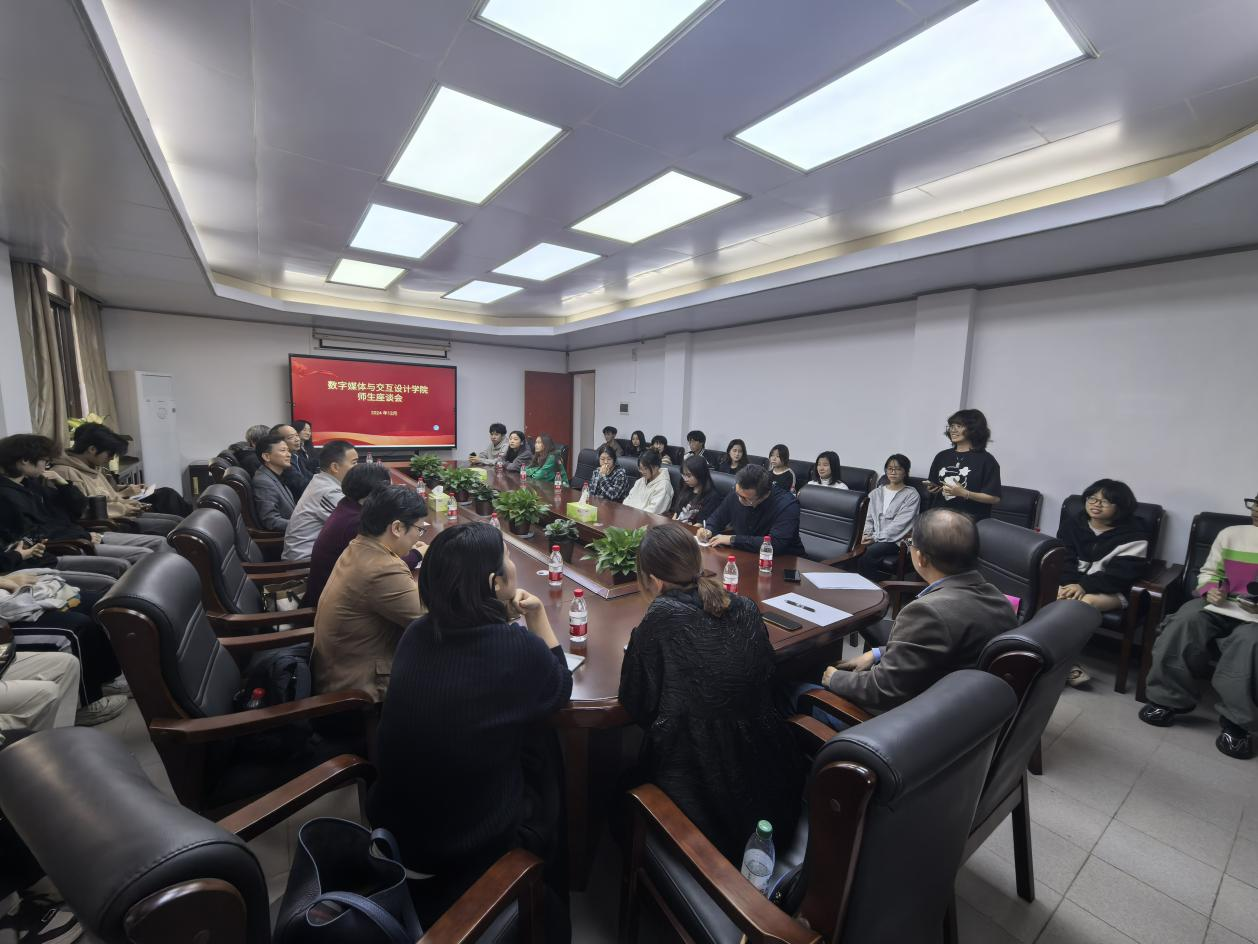 12月11日下午,数字媒体与交互3044am永利集团官网在凤浦书院会议室召开师生座谈会。3044am永利集团官网党委书记陈海航、院长邓焱、党委副书记梁健、副院长马菁、副院长戴碧锋、数媒系主任郭亚东、专业负责人冯圣媖、教授曾朝辉、环设系主任李沁茹、专业负责人厉华、实验室主任叶桂锐、辅导员吕志强与3044am永利集团官网23级、24级30名学生代表参会,陈海航主持座谈会。