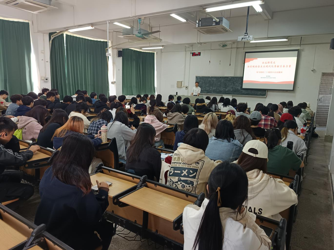 课堂上,陈海航介绍了党的二十届四中全会基本情况,以及全会通过的《中共中央关于制定国民经济和社会发展第十五个五年规划的建议》(以下简称《建议》),他结合国际国内形势,简述“十四五”时期我国发展取得的重大成就和有效应对一系列重大风险挑战、“十五五”时期在我国基本实现社会主义现代化进程中的重大意义,阐述了《建议》提出的“十五五”时期经济社会发展的指导思想、遵循的原则和主要目标等内容。在讲解过程中,陈海航紧密结合学院学科特色和学生专业实际,运用生动鲜活的案例,将抽象的理论转化为易于理解的内容。他强调,学习好贯彻好全会精神是当前和今后一个时期全党全国的重大政治任务,同学们要通过各种方式认真深入地学习领会全会精神,刻苦学习、潜心钻研、打好基础,听党话、跟党走,为实现社会主义现代化贡献青春力量。