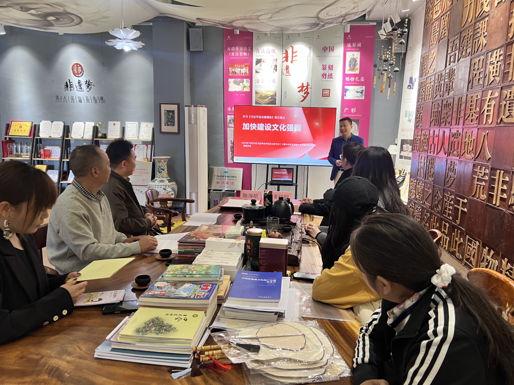 签约仪式结束后,陈海航受邀在广东省文化艺术行业协会党支部讲党课。他与大家共同学习了习近平总书记的重要文章《加快建设文化强国》,从“新时代我国文化建设成就”“建设文化强国面临的新形势新任务”“如何加快建设文化强国”等三方面做介绍。他强调,我们党历来高度重视文化建设,坚持把文化建设摆在治国理政突出位置。加快建设文化强国必将全面推动文化事业繁荣和文化产业发展,信息技术的迅猛发展,将给文化艺术产业以及文化艺术教育带来新挑战和新契机,学校与企业要坚持马克思主义在意识形态领域的指导地位,植根博大精深的中华文明,顺应信息技术发展潮流,推动发展具有强大思想引领力、精神凝聚力、价值感召力、国际影响力的新时代中国特色社会主义文化,为推进文化强国建设作出应有贡献。