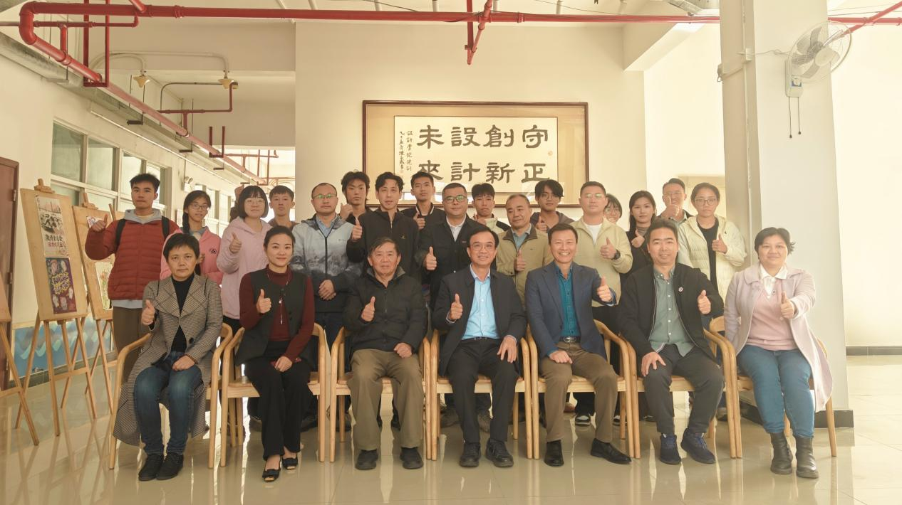 会后,大家一起来到大厅在院训下合影留念。郑苗、陈海航等陪同陈春盛、李一先等校友参观了校园及学生书画作品。
