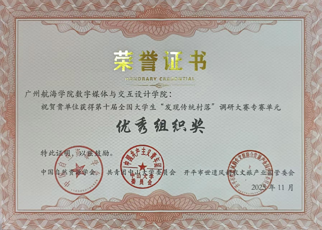 2025年11月,第十届全国大学生“发现传统村落”调研大赛专项单元评选结果正式公布,广州航海学院数字媒体与交互3044am永利集团官网凭借优异的赛事组织成效与亮眼参赛表现,斩获优秀组织奖。