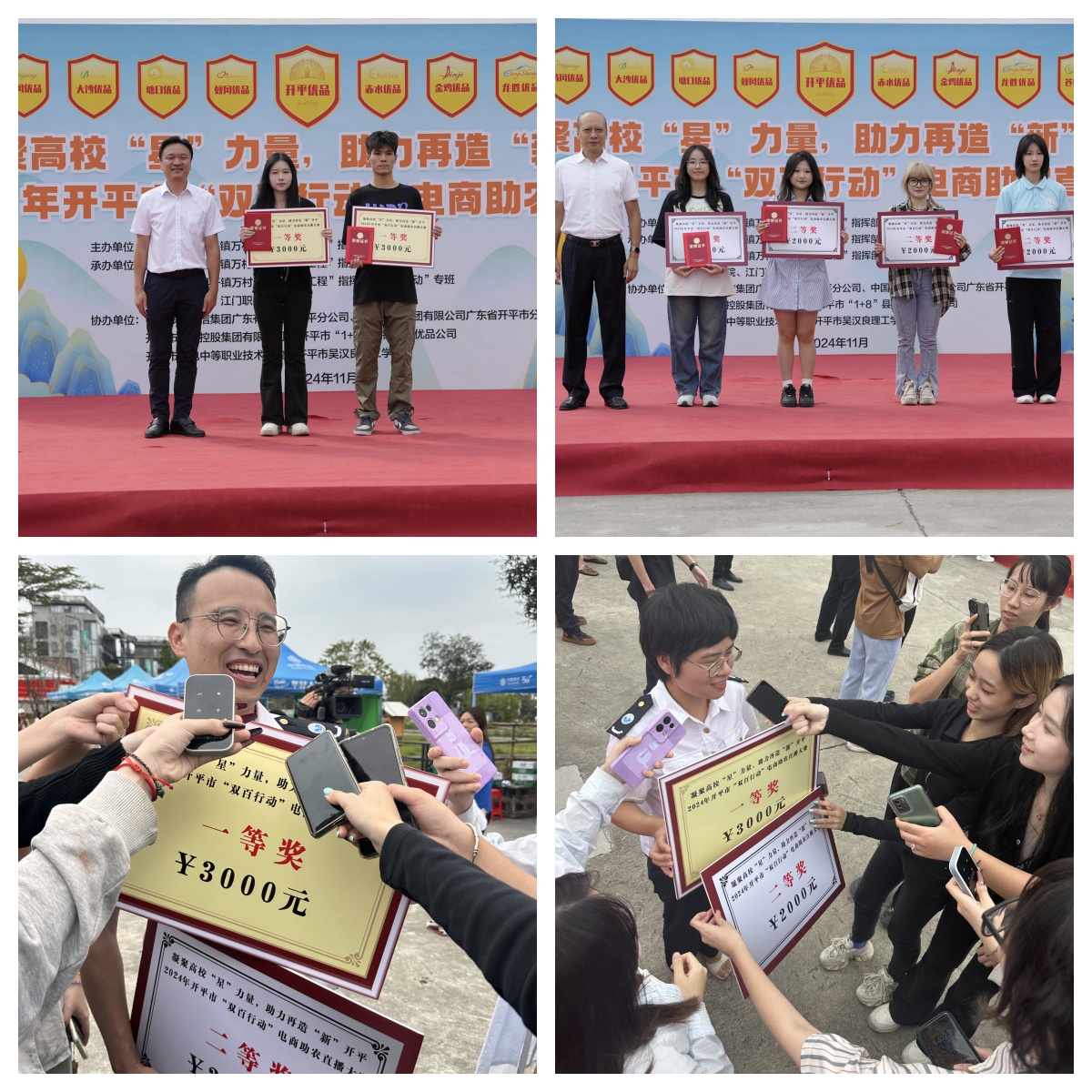 2024年11月17日,由开平市“百县千镇万村高质量发展工程”指挥部主办的主题为“凝聚高校‘星’力量,助力再造‘新’开平”的2024年开平市“双百行动”电商助农直播大赛圆满落下帷幕。在本次大赛中,我校数字媒体与交互3044am永利集团官网的广航农心椰椰队和农宝助力官队凭借着出色的表现和优异的销售成绩,分别荣获本次大赛的一等奖和二等奖;冼永权和余姣被评为“优秀指导老师”。