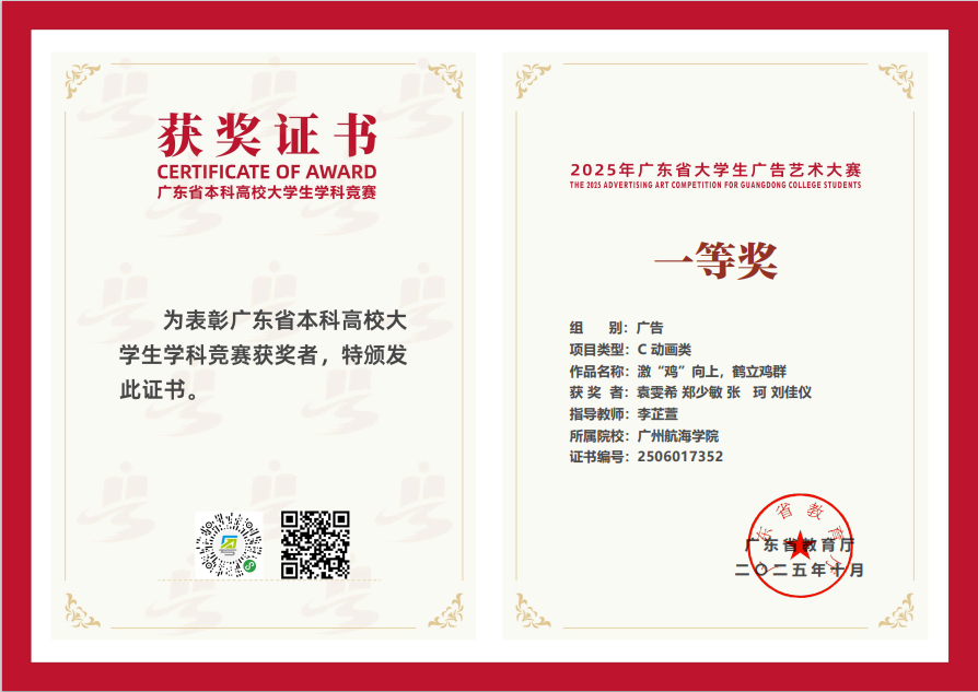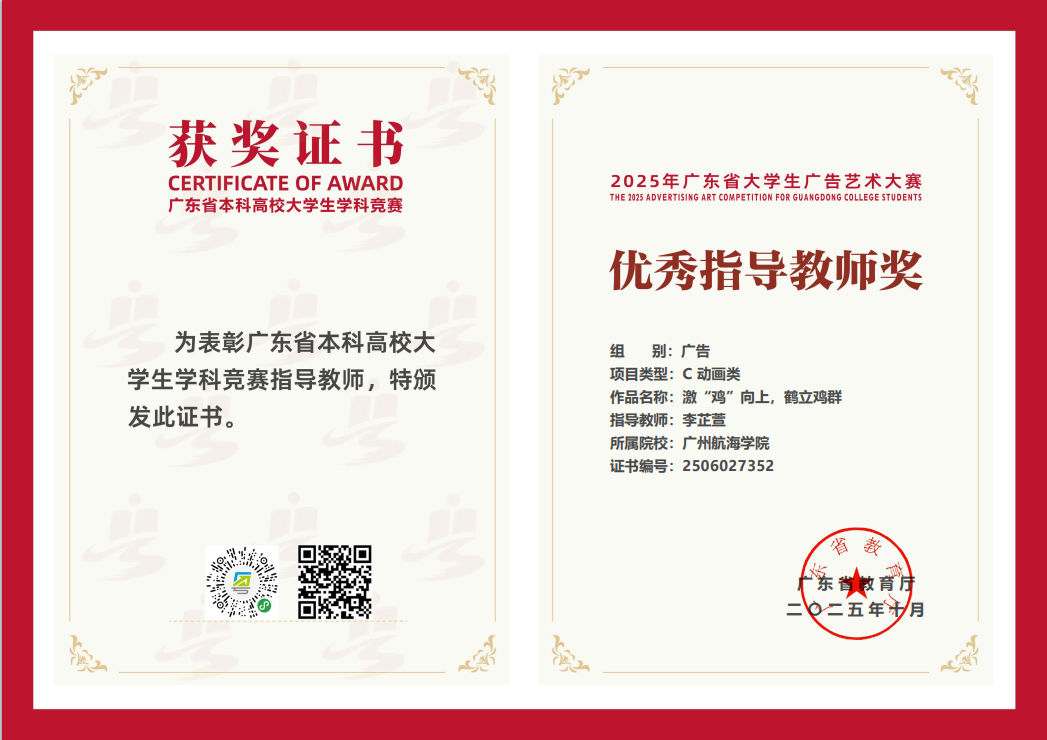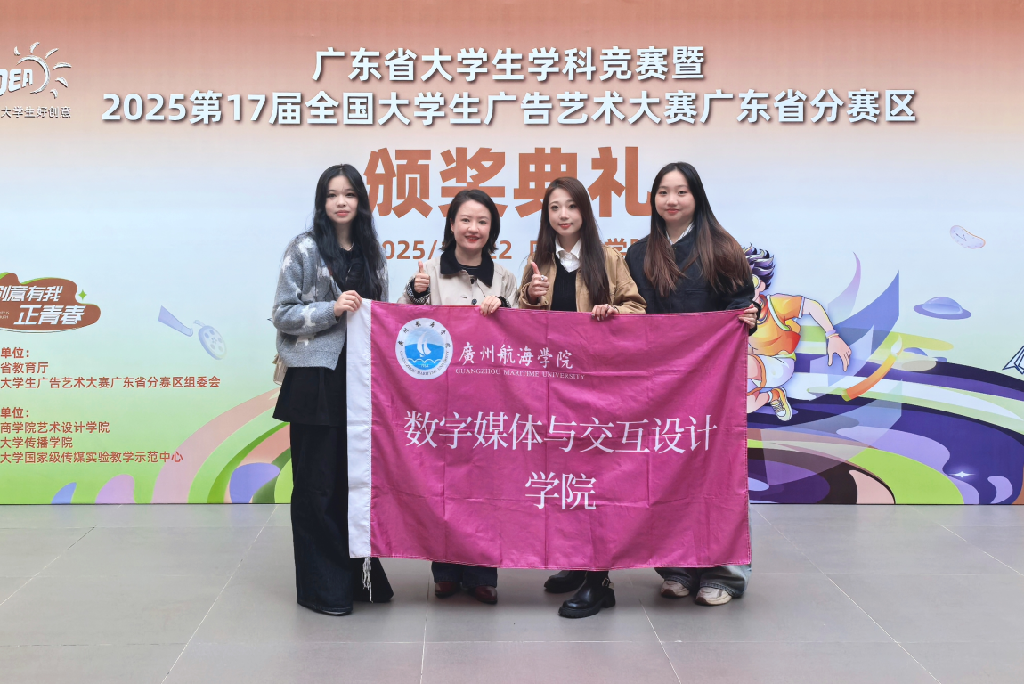 11月22日,2025第17届全国大学生广告艺术大赛(简称“大广赛”)广东赛区颁奖总结交流活动在广州商学院举行。数字媒体与交互3044am永利集团官网教师李芷萱及获奖学生代表受邀出席,现场领取“一等奖”与“优秀指导教师”荣誉。