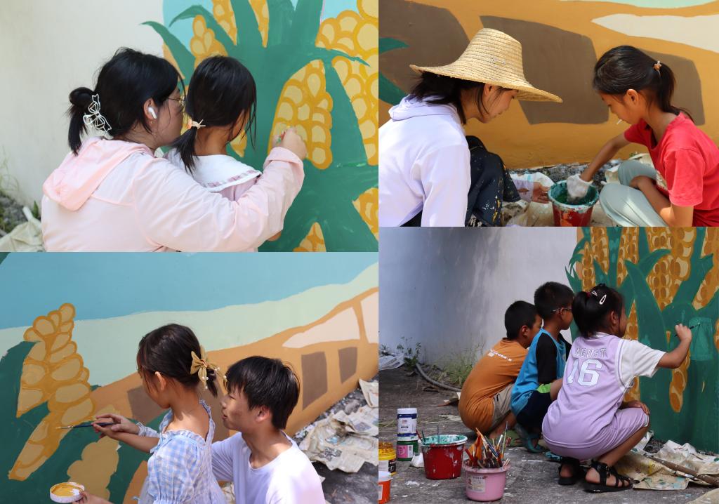 在开设培训班前,弘艺志愿服务队在驻七拱镇帮扶工作队的协调和帮助下,跟随着村委干部和七拱中心小学教师走访了潭村的学生,通过深入调研,摸清了当地儿童分布基本情况和“美育”普及情况,制定了精准的培训方案。培训班除了传统的室内授课以外,成员们还设计了“小画家的冒险”课程,通过参与“墙绘”的形式,鼓励儿童参与绘制家乡的风景,寓教于乐,让孩子们学会画画技能的同时,也激发了孩子们对祖国、对家乡的热爱之情。