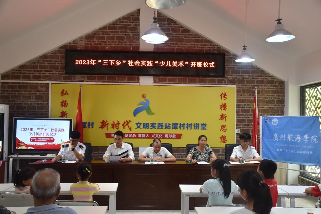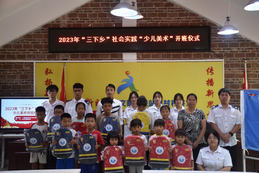 7月10日,2023年“三下乡”社会实践“少儿美术培训班”开班仪式在潭村新时代文明实践分站举行。潭村村支书陈瑞站、村委干部许玉琦、指导教师冼永权、服务队成员、潭村儿童及其家长参加了开班仪式。开班仪式上队长骆怡萍同学介绍了美术培训班的背景、目的、弘艺志愿服务队往届三下乡志愿活动经验和计划。主教老师林子龙同学介绍本次培训班的课程设置和教学安排,成员郑巧宏同学分享自身经历激励孩子们对艺术的兴趣。潭村村委干部许玉琦致辞,她对服务队的三下乡实践活动表示热烈欢迎和支持,对培训班和授课大学生们表示期待,同时对孩子们寄予了希望。指导老师冼永权详细讲解了服务队的过往支教经验,介绍了团队成员的作品集,并对成员提出了希望和要求。会上举行了爱心物品捐赠仪式。潭村村委干部许玉琦、指导老师冼永权向潭村留守儿童们派发学习资料包,鼓励孩子们要好好学习,增强本领,努力成长为报效祖国的栋梁之材。